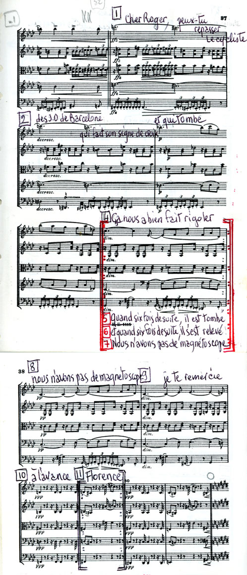 "Compte-rendu d’analyse" commençait par une rythmique de piano à 7/8 rejointe au bout de huit mesures par un chromatisme synthétique qui arrivait en crescendo sur trois parties de bois contrepointues (clarinette, flûte, basson) introduisant pendant vingt-quatre mesures le premier thème à mon avis le plus reconnaissable, ce qui ressemblait le plus à un refrain donc le plus déclarationnable. Et ce sont les huit premières mesures de ce thème que j’avais inscrites sur le bulletin de déclaration.